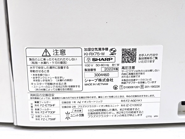【中古品】 シャープ SHARP 加湿空気清浄機 ~34畳 KI-RX75 2022年製 ホワイト ○YR-19420○