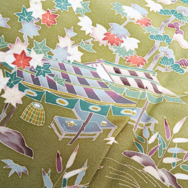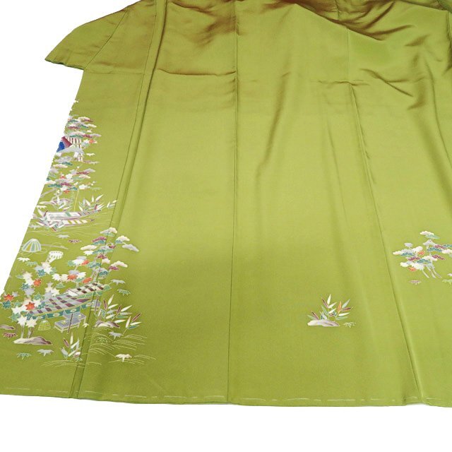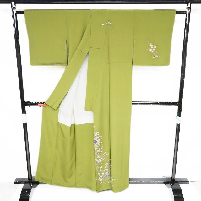 訪問着 着物 中古 正絹 袷 フォーマル 紋付き 加賀友禅 柿本市郎 花の図 柳色 多色 身丈161cm 裄64.5cm M きもの北條 A1128-5
